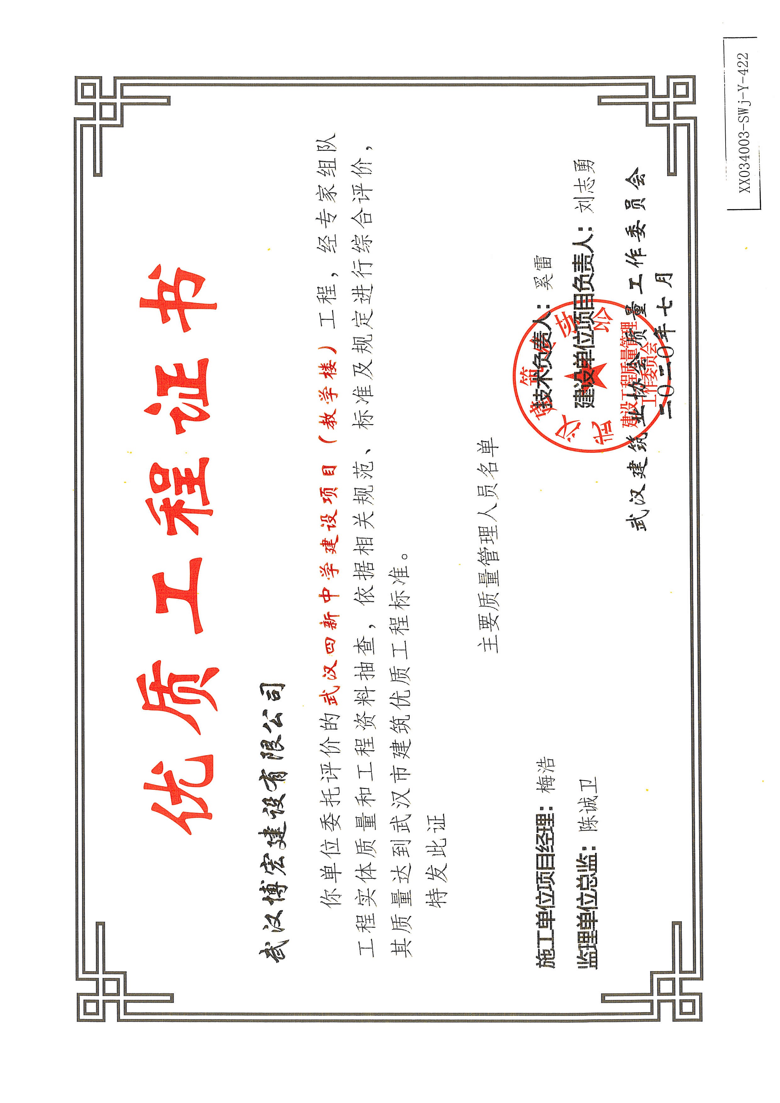 優(yōu)質(zhì)工程證書(武漢四新中學(xué)建設(shè)項目工程(1、2號學(xué)生公寓及食堂)