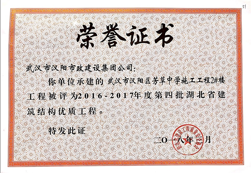 結(jié)構(gòu)優(yōu)質(zhì)工程證書(芳草中學(xué)綜合2號(hào)樓)
