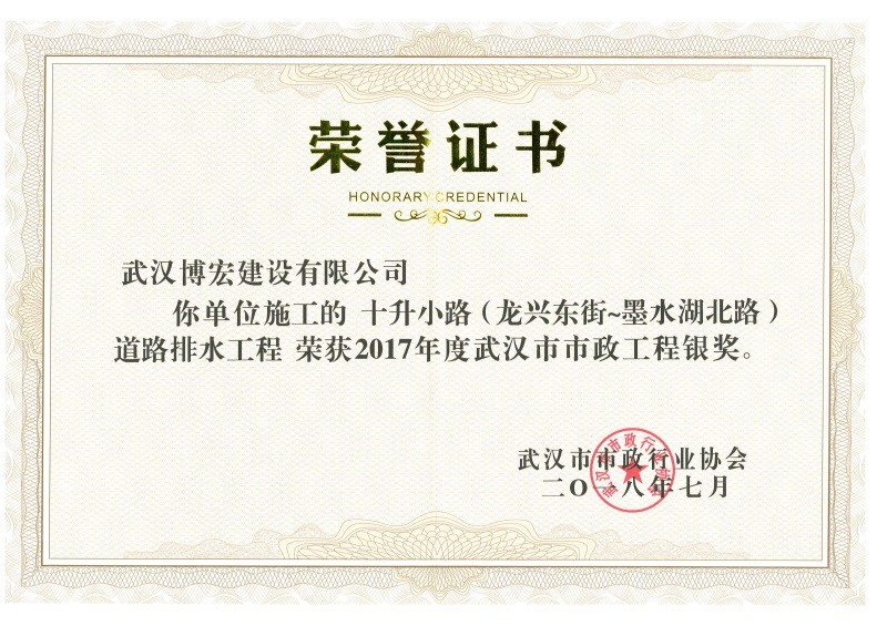2017年度武漢市市政工程銀獎(jiǎng)(十升小路(龍興東街~墨水湖北路)道排工程)
