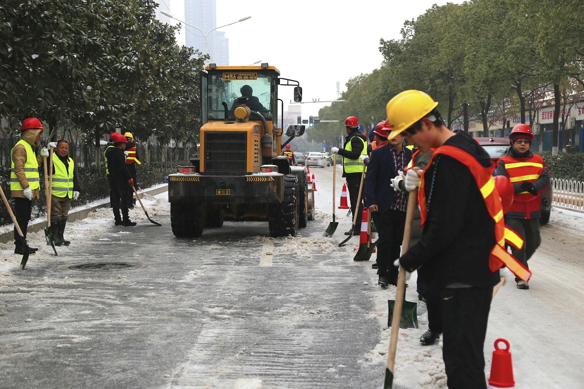 本次行動(dòng)中公司出動(dòng)人員160余人,正鏟車7臺(tái),防凍手套、反光背心、礦泉水等物資一應(yīng)俱全,董事長兼總經(jīng)理錢濤親自帶隊(duì)指揮,領(lǐng)導(dǎo)班子集體出動(dòng)來到一線參與除雪,部分干部職工更是不顧個(gè)人感冒的身體情況,堅(jiān)持親自參與除雪,并駐守現(xiàn)場指揮調(diào)度。這次行動(dòng)中,無論是老職工還是新員工,大家手腳齊用,人車并進(jìn),熱情高漲。氣溫雖寒,道路雖長,但架不住博宏建設(shè)廣大職工高漲的熱情與高效的作業(yè),截止當(dāng)天下午6點(diǎn),琴臺(tái)大道全線單邊除雪基本完成,車輛通行無阻。
