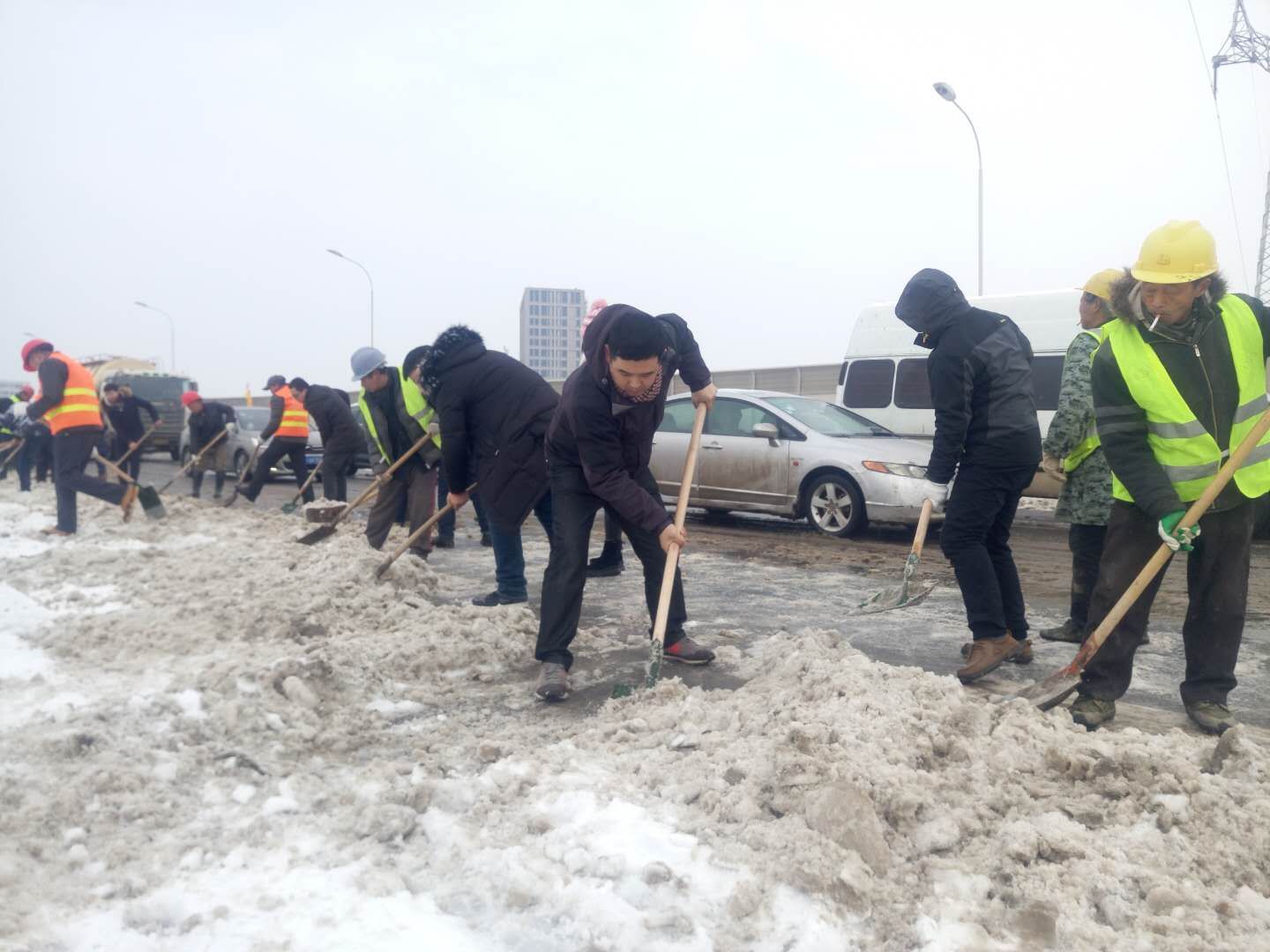 1月28日,公司廣大職工不畏低溫嚴(yán)寒,來到三環(huán)線(龍陽大道~漢陽大道)路段,繼續(xù)奮戰(zhàn),男女齊上陣。期間,漢陽區(qū)委書記馬澤江、集團(tuán)公司董事長嚴(yán)悌文等領(lǐng)導(dǎo)來到現(xiàn)場(chǎng)指揮工作,為廣大建設(shè)者鼓勁兒加油,下午2點(diǎn),基本完成主干道清掃,車輛予以通行,截至5點(diǎn),徹底完成三環(huán)線(龍陽大道~漢陽大道)路段的積雪清掃工作。隨后,鏟雪隊(duì)伍搶抓時(shí)間,來不及休息便再一次來到琴臺(tái)大道對(duì)昨夜的積雪進(jìn)行二次清除,進(jìn)一步拓寬快車道,下午6點(diǎn)30分完成拓寬任務(wù)。