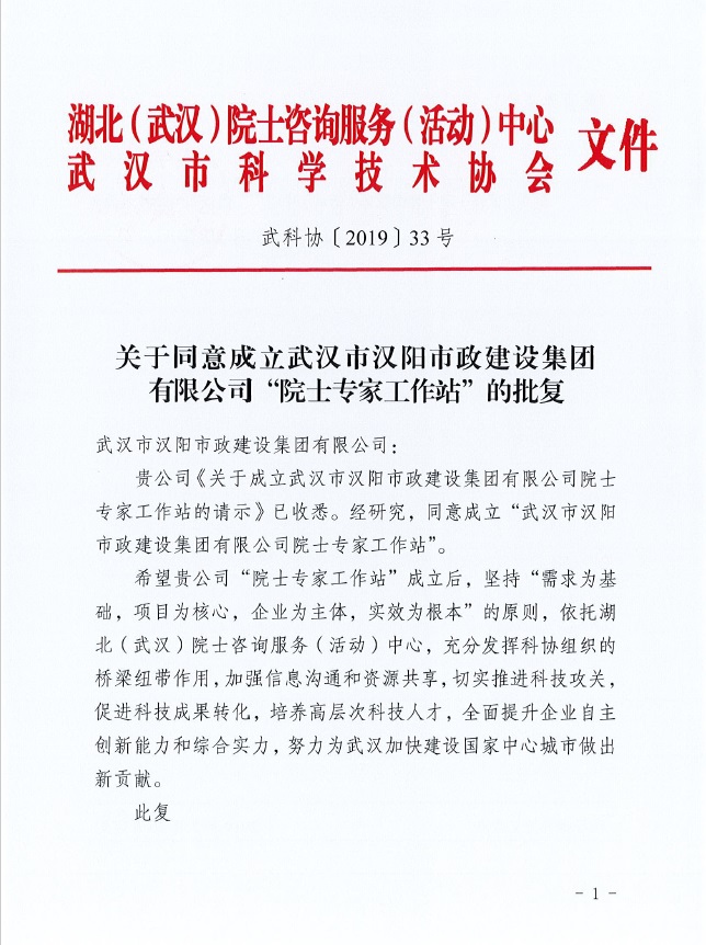 2019年5月20日,湖北(武漢)院士咨詢服務(wù)(活動)中心、武漢市科學技術(shù)協(xié)會正式批復同意成立武漢市漢陽市政建設(shè)集團有限公司院士專家工作站。