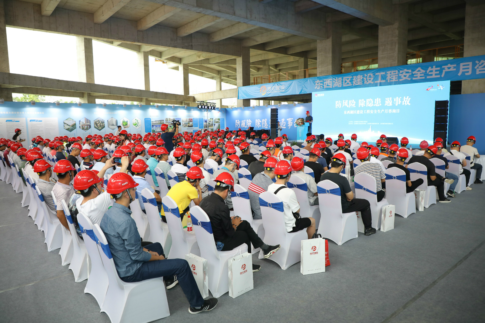 ??? 6月16日,東西湖區(qū)屬建筑施工企業(yè)和在建工程管理人員共計(jì)260余人相聚在武漢食品檢驗(yàn)檢測(cè)中心項(xiàng)目現(xiàn)場(chǎng),通過(guò)觀摩現(xiàn)場(chǎng)安全文明情況、領(lǐng)取安全文明手冊(cè)、咨詢安全管理問(wèn)題、問(wèn)卷調(diào)查、觀看安全生產(chǎn)警示教育片等方式共同參與到本次安全生產(chǎn)月活動(dòng)中來(lái)。此次活動(dòng)呈現(xiàn)兩大亮點(diǎn):一是播放宣傳片更加貼近生活,往年的宣傳片,多半是建筑施工安全、消防安全等傳統(tǒng)教育類視頻,今年活動(dòng)圍繞安全生產(chǎn)和文明施工,專門制作了《防線》、《體育中心安全文明》、《創(chuàng)杯項(xiàng)目錦集》三部宣傳片,展示了武漢市優(yōu)質(zhì)大型項(xiàng)目在施工管理上的好做法,使來(lái)賓能從中找到共鳴;二是新增了現(xiàn)場(chǎng)問(wèn)卷答題,更注重互動(dòng)性與參與性,答完題后邀請(qǐng)專家現(xiàn)場(chǎng)解答互動(dòng),對(duì)安全管理的工作疑慮進(jìn)行了有效溝通。