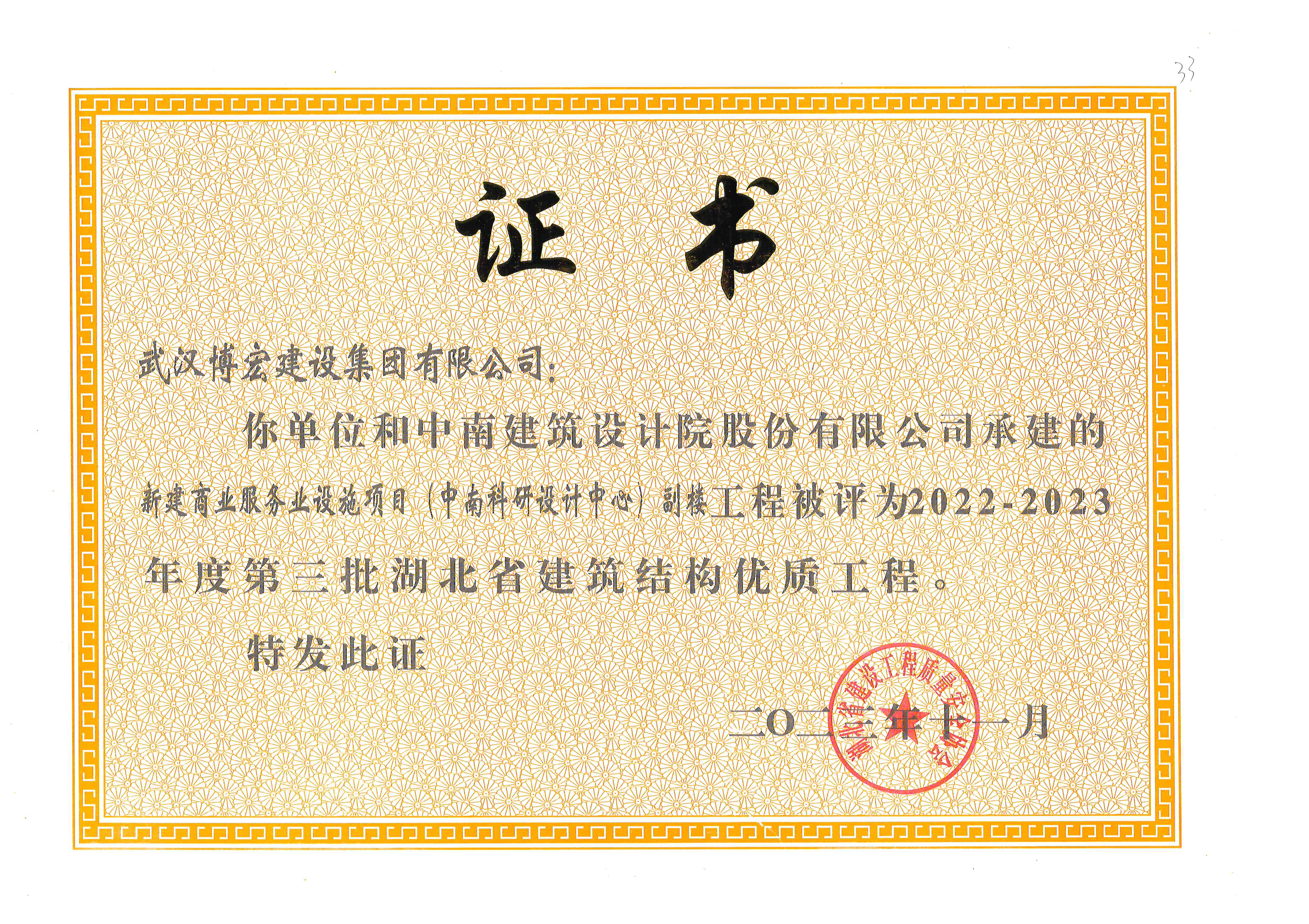 近日,湖北省建設(shè)工程質(zhì)量安全協(xié)會公布2022-2023年度第三批湖北省建筑結(jié)構(gòu)優(yōu)質(zhì)工程項目名單,由博宏建設(shè)集團承建的居住項目(黃金口村還建房B地塊)17#樓,居住項目(四臺村還建房B地塊)1#樓,新建商業(yè)服務(wù)業(yè)設(shè)施項目(中南科研設(shè)計中心)副樓,商業(yè)、商務(wù)設(shè)施、居住項目(產(chǎn)權(quán)調(diào)換房)3#樓、6#樓,國投·汀蘭7#樓、8#樓、9#樓、12#樓,隨州市中心看守所辦公區(qū)、監(jiān)區(qū)及配電房榮獲湖北省建筑結(jié)構(gòu)優(yōu)質(zhì)工程獎。